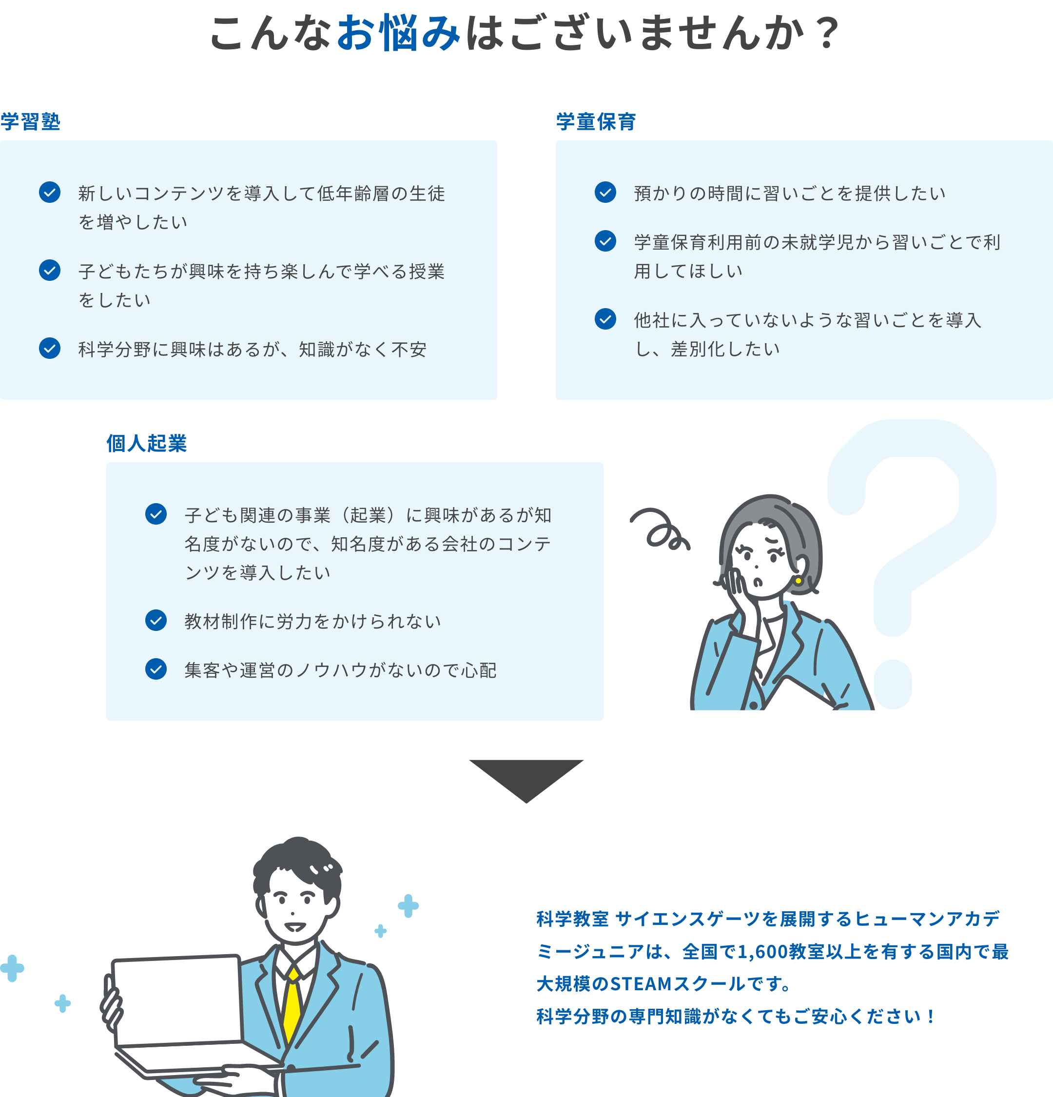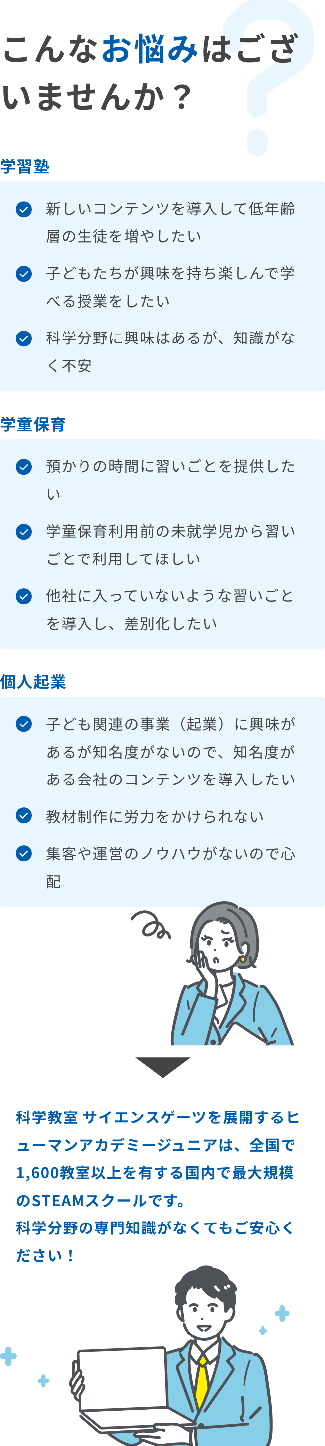 生徒情報管理システムや映像教材等の導入・使い方に関して、専任のアドバイザーが丁寧にご説明します。導入後も活用法について随時最新情報をお届けするとともに、お困りのことがあればサポートいたします。