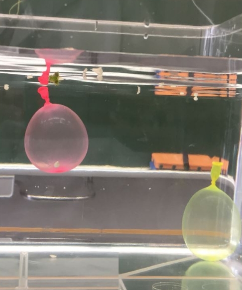 - 冷たい水風船が浮いて、お湯の水風船は沈んだ