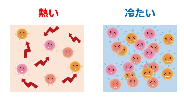 一方、冷たい水は、分子があまり動き回らないため分子同士がギュッと集まっている。
