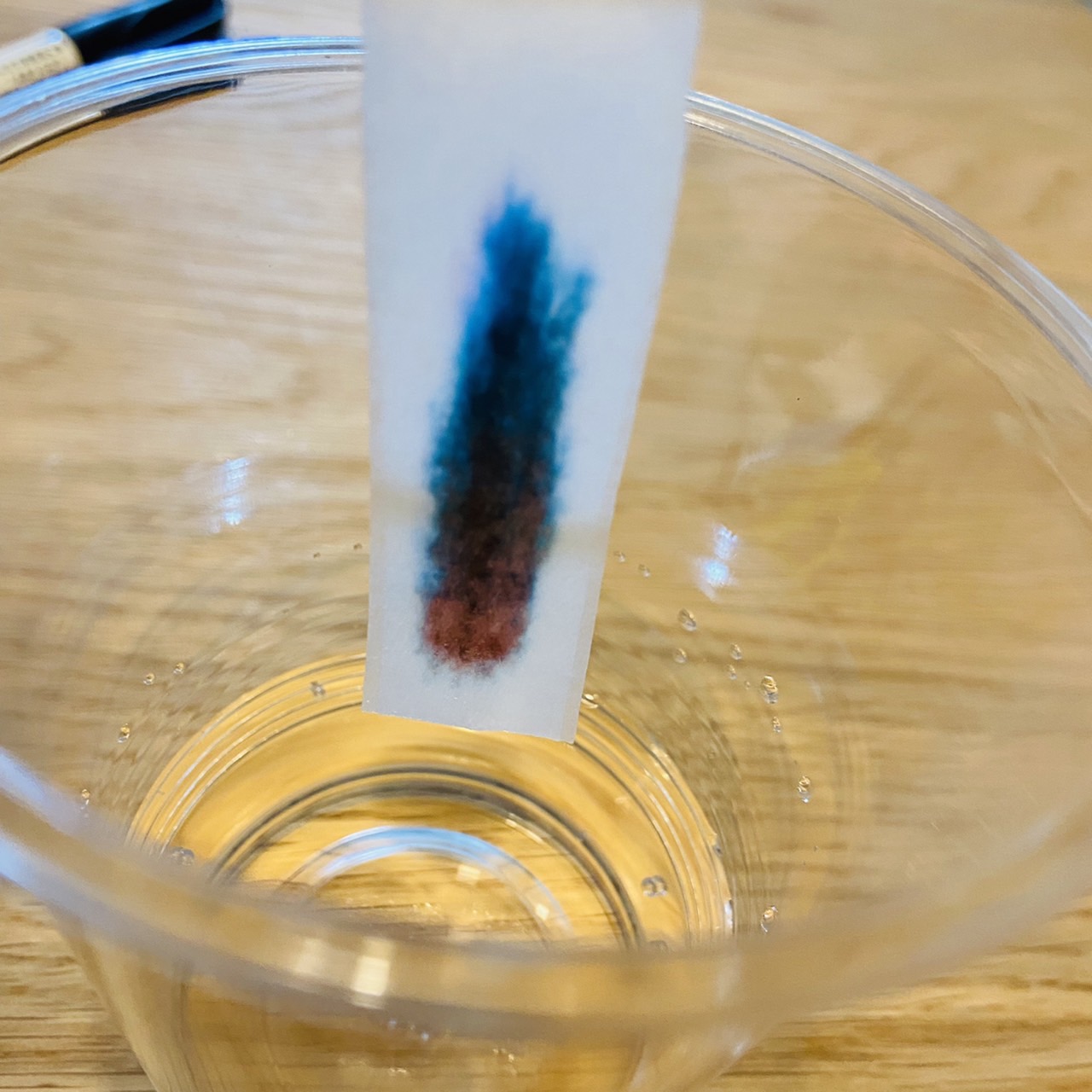 短冊状の濾紙に水性ペンで印をつけ、その下部を水につけると、水が濾紙にしみこんで、だんだんとペンの色が滲んできます。