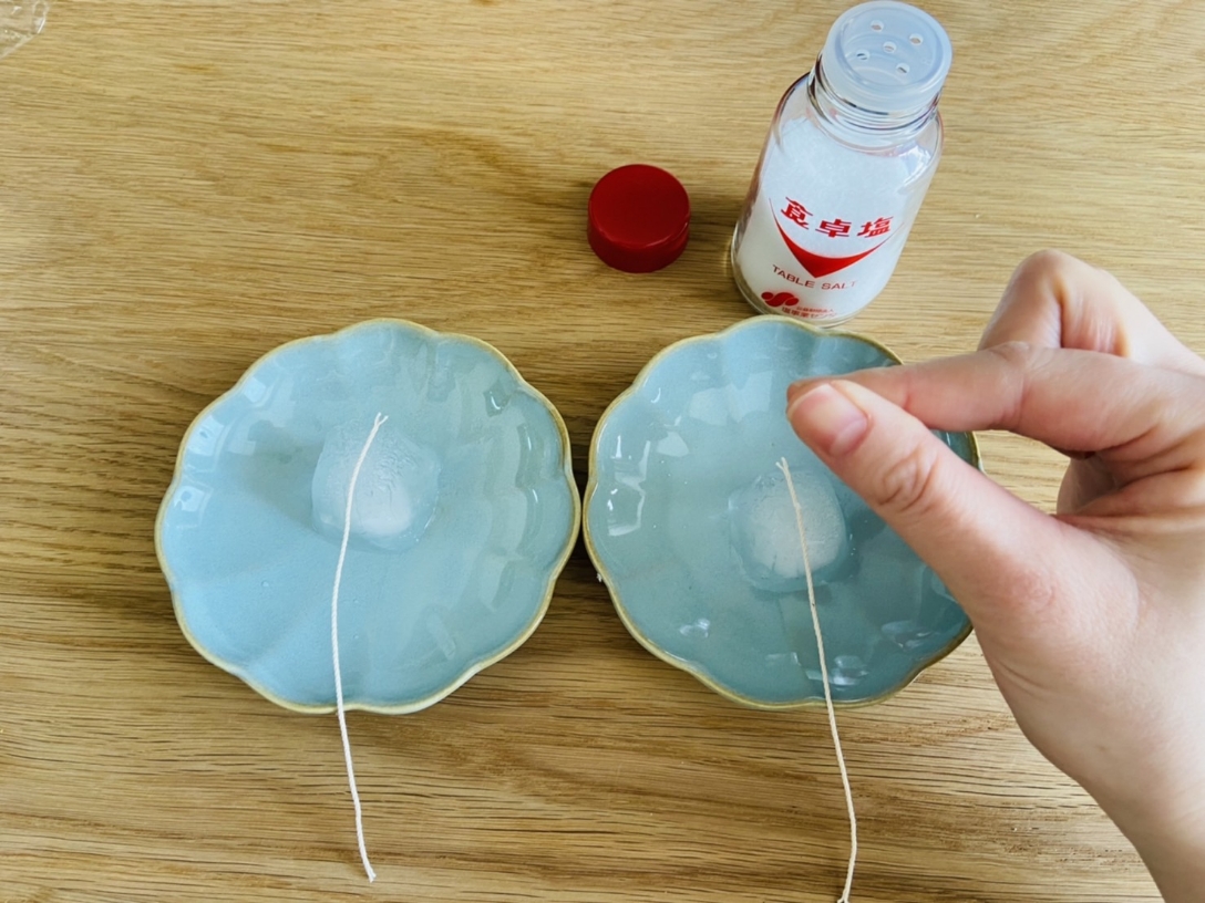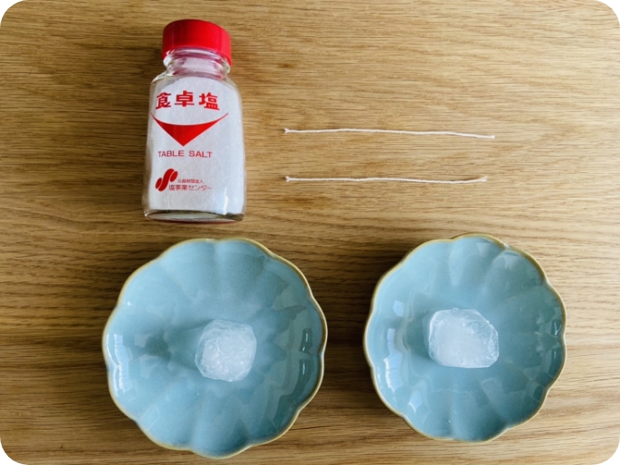 片方の氷はそのまま、もう片方の氷には塩をひとつまみかける