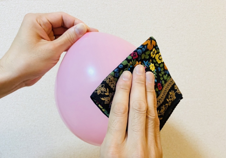浮かせた風船(A)をハンカチで30回ほどこする。