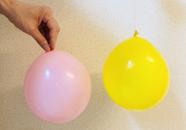 電気にプラスとマイナスがあるのはご存知のことと思いますが、綿のハンカチでこすることで風船はプラスの電気を帯びます。同じようにもう1つの風船をこすると、こちらもプラスの電気を帯びます。そしてその風船同士を近づけるとプラスとプラスで反発し合い、ひもでつるした方の風船が逃げるように動いた、というわけです。