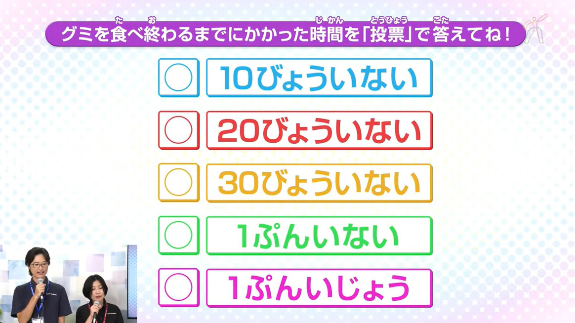 また、株式会社明治の研究所の方もゲストにお迎えし、ちょうどいい「かみごたえ」のグミを作るためにどんな研究をしているのか、分かりやすく教えていただきました!