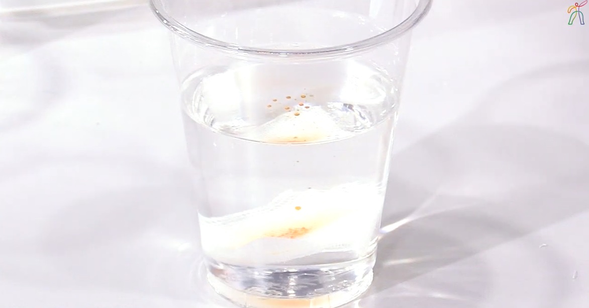 白い布にラー油をたらして、洗剤の入った水の中に入れてみると、だんだん油が浮き上がって…?