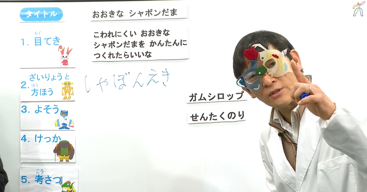 大きなシャボン玉を作る実験や、お酢にお湯や水などを入れるとどうなるのか調べてみる実験など…おもしろいアイデアを紹介し、樋口先生に実験の進め方・まとめ方のポイントを教えていただきました。