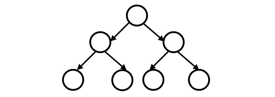 これは木構造の中でもよく使われる「二分木」の形ですね。丸の部分を「ノード」、そこから出ている矢印を「エッジ」と呼びます。ノードから最大ふたつのエッジが出て下のノード(エッジ元のノードの「子ノード」と呼びます)を繋いでいる形です。 これ木なの? と思われるかもしれませんが、データ構造の世界にはこういう木がにょきにょき生えているものだと思ってください。にょきにょき、上から下へ。