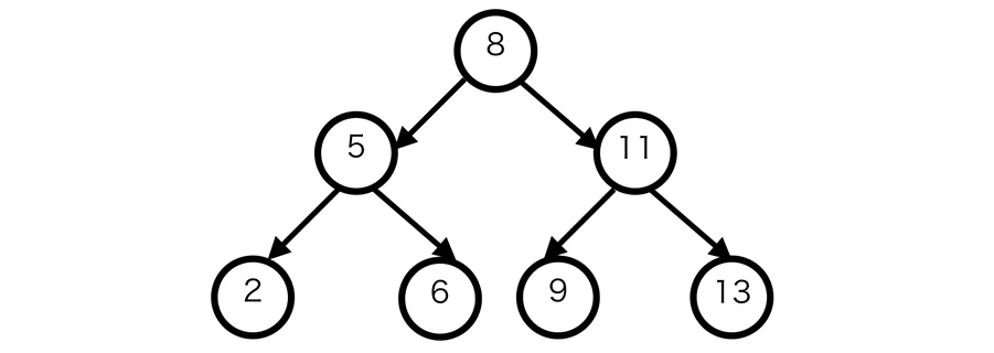 まず一番上の「8」のノード(起点のノードを特別に「ルート(根)」と呼びます)の左右の子ノードをみてみましょう。左のノードの「5」は8よりも小さいですね。右のノードの「11」は8よりも大きいです。では、左の「5」に注目を移してみましょう。子ノードのうち、左のノードの「2」は5よりも小さいですね。右のノードの「6」は5よりも大きいです。どのノードに注目しても、その子ノードとの関係は同じです。左の子ノードに進むと小さな値、右に進むと大きな値。