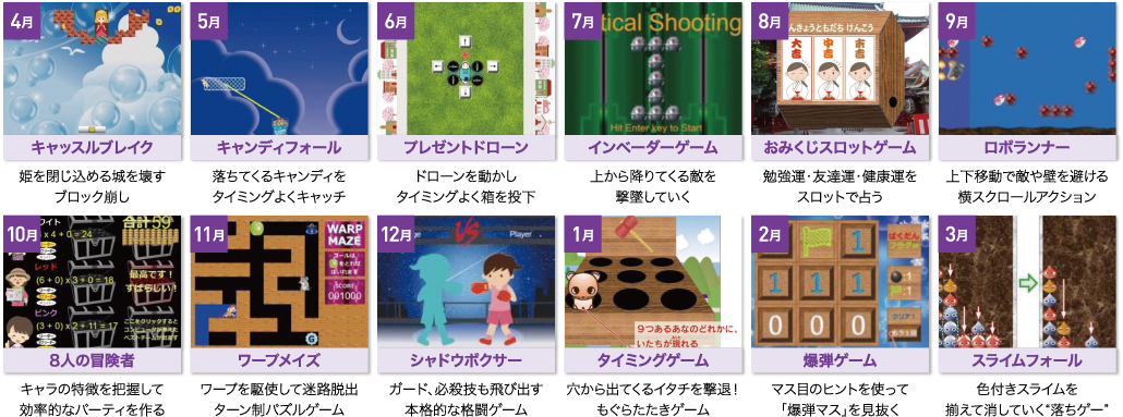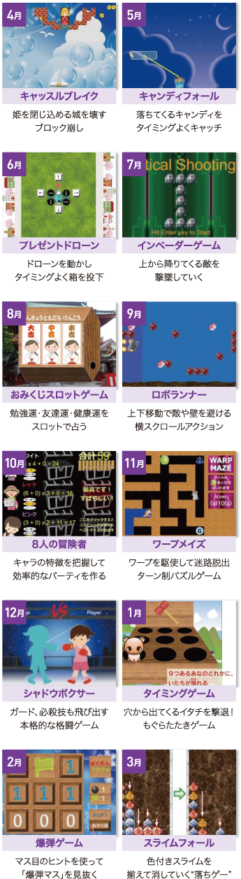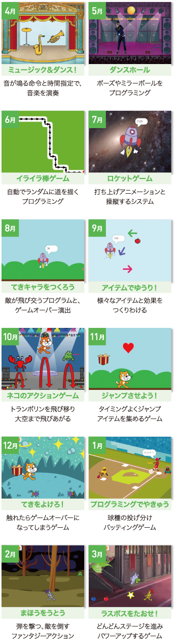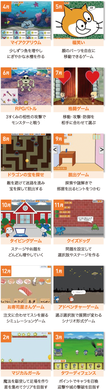 | 内容 | その回で学ぶべき要素を使いながら、プログラムの下地を作っていきます。 見本通りにプログラムを作って動作をチェックし、今回使った命令がどのような処理なのか、どういった点が便利かなどを自然と学べる内容です。 |