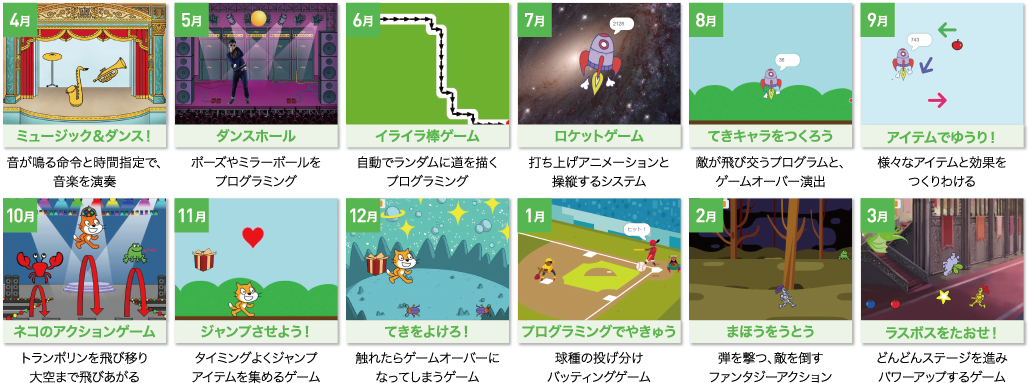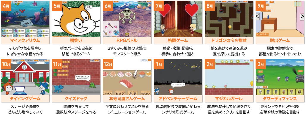 | 1回目 | Scratch | 毎回10個の課題解決にチャレンジ |