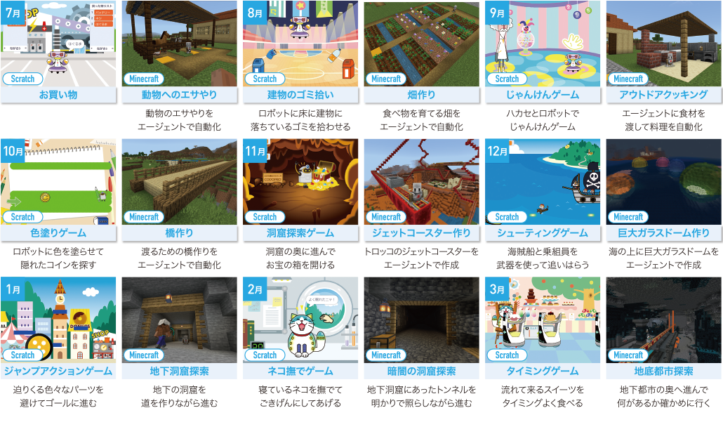 通常講座:Scratch 月1回・Minecraft 月1回×12ヶ月(全24回)