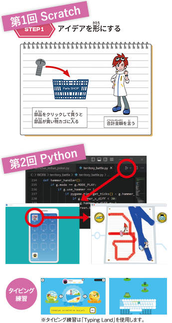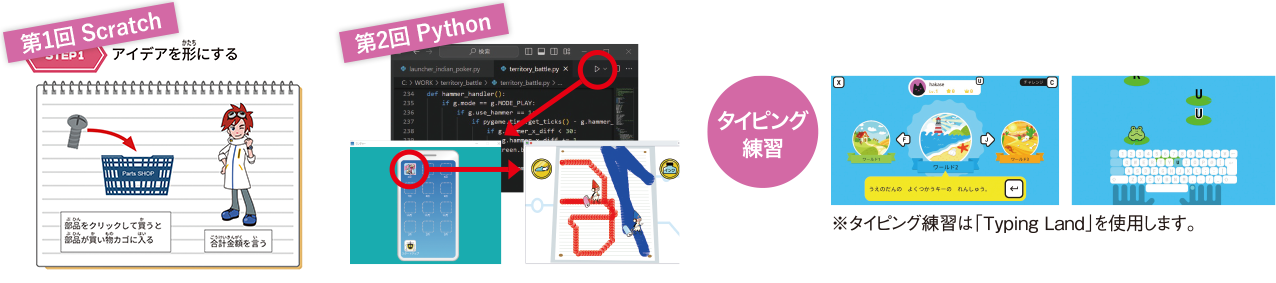 - 学んだプログラミングスキルを活かしてScratchでゲームやアプリの表現力を身につけつつ、「Python(パイソン)」でコードプログラミングの基礎を学びます。