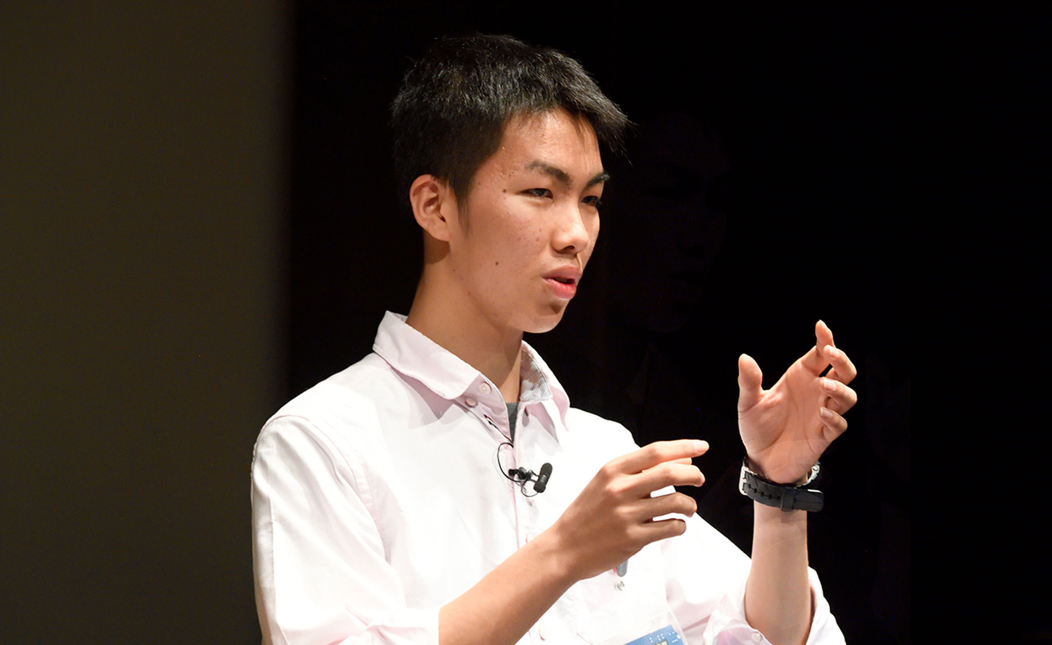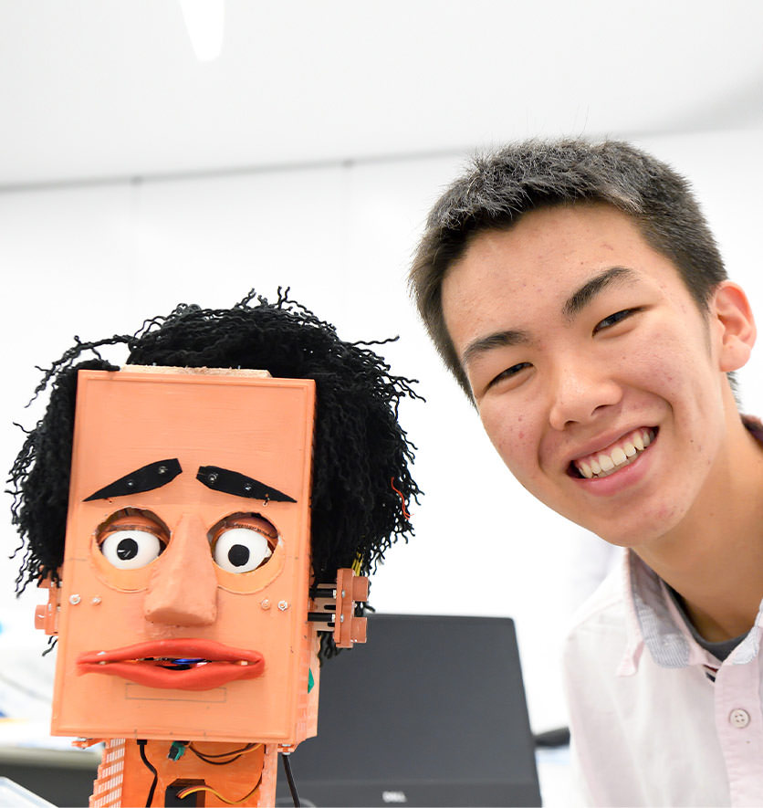 現在は、高校に通いながらロボティクスプロフェッサーコースに通っています。先日のロボプロ全国大会では、僕の作った「コミュニケーションロボ」がヒューマン特別賞を受賞しました。コミュニケーションを取ることを目的としたロボットなので、たくさんのセンサーを使って、様々な動きができるように工夫しました。これからもあっと驚くような作品を作っていきたいです。
