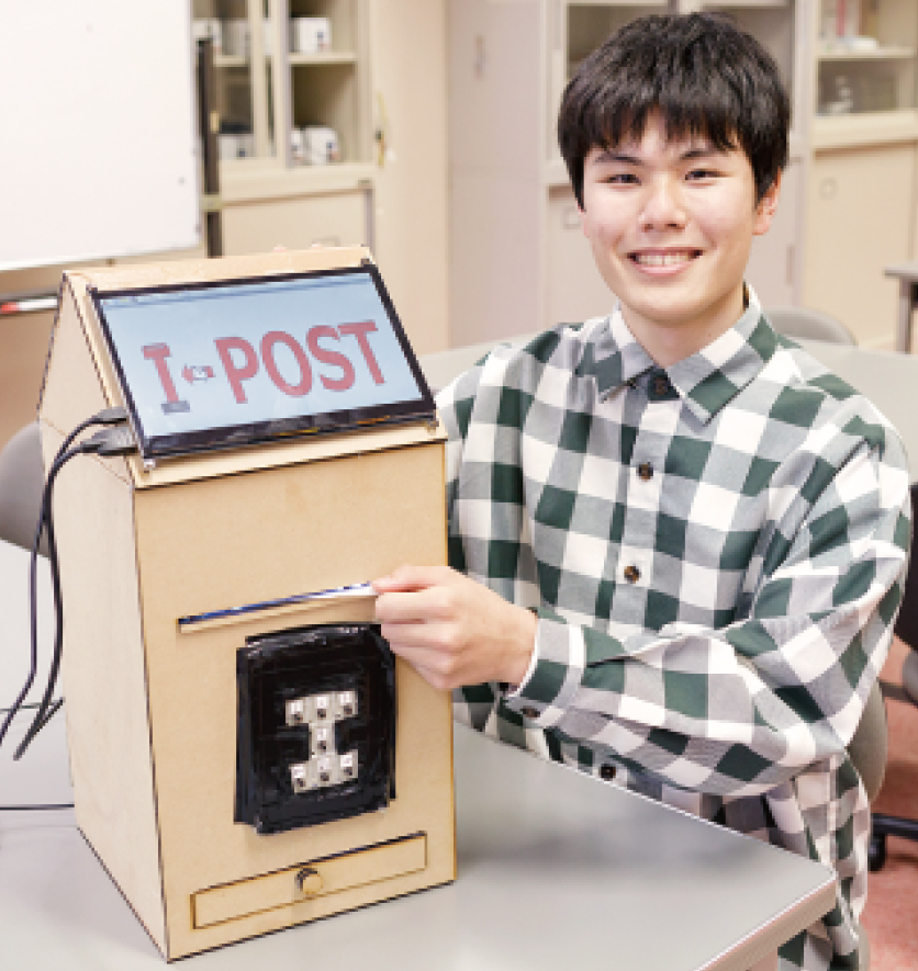 スマホを不便に感じる祖父母世代が、アナログで書いた紙をポスト型のデバイスに投函し、孫世代はスマホで受信できるというもの。デバイス、アプリ、システム開発などをチームで手掛けた。