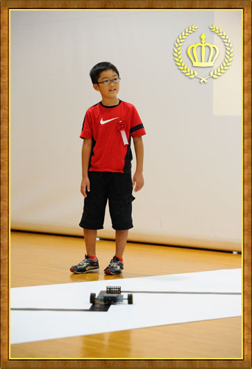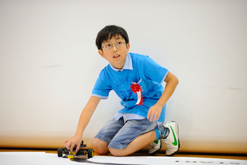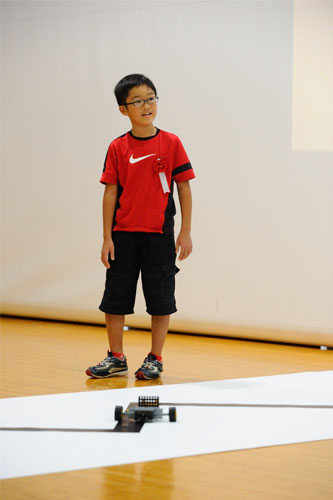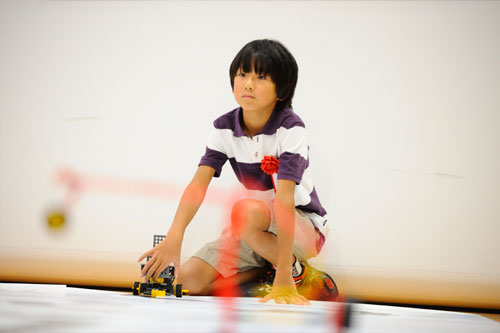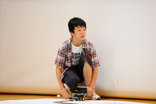 光センサーを使って、白い紙に描かれた黒い線に沿ってロボットを走らせ、最後に設置したパーツを正確に取り込んでゴールさせるまでのタイムを競い合うロボットテクニカルコンテスト。色認識が上手くできないと、コースアウトしてしまったりカーブで大回りしてしまったり。センサーの取り付け方などスピード以外の要素も勝敗を分けます。