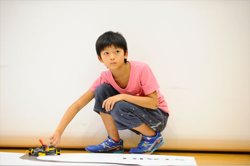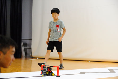 見事トーナメントを勝ち抜いて優勝を手にしたのは、藤田太陽くん(狭山池前教室/小5)。高橋先生に、「パーツを取り込むところにゴムをつけることで取り込む際の衝撃を吸収し、はじかないような工夫をしている。こういった工夫もあって優勝という結果につながった」とコメントしていただくと、うれしそうな表情を見せていました。