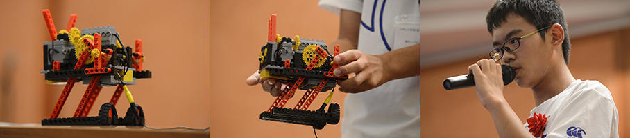 ロボットアイデアコンテストの第1回から第3回まで3連覇を成し遂げた大澤君。お父さんと作ったパワーポイントを使い、ロボット教室との出会いから過去の受賞作品などをユーモアたっぷりに紹介し、会場を沸かせてくれました。新作を披露した後に、「ロボット教室に出会ったことで、ロボットクリエーターか皆が驚くようなモノを作る、という将来の目標を持つことができました」と、胸を張って発表した姿が印象的でした。