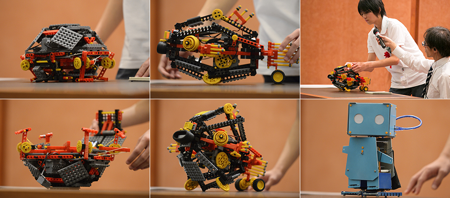現在、ロボプロティクスプロフェッサーコースに通っている先輩2人による新作ロボット発表です。アイデアコンテスト3連覇を成し遂げた大澤君と昨年MVP賞の鳥山君が今年も凄いロボットを持って会場にかけつけてくれました。