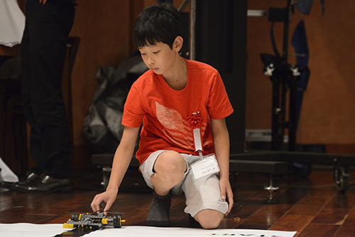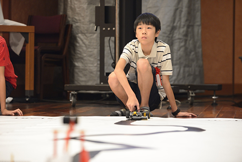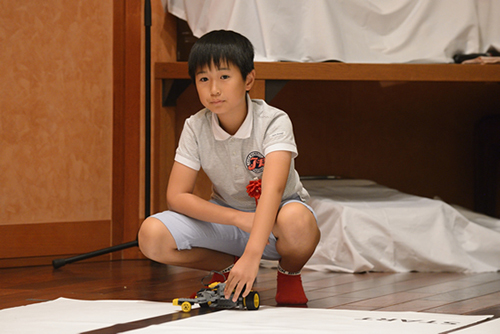 光センサーを使って決められた黒いラインのコースを走らせ、ゴール地点に設置された旗を規定の高さまで上げてゴールとなります。