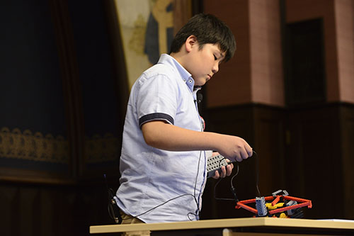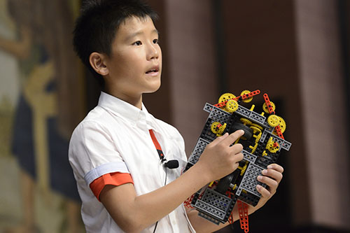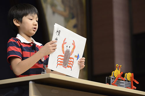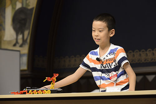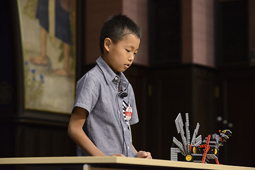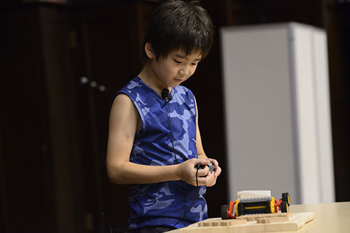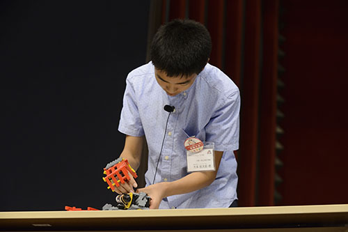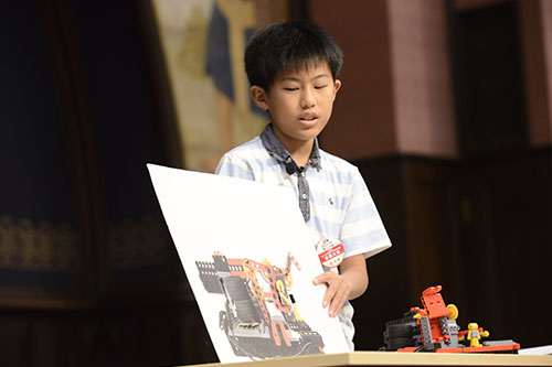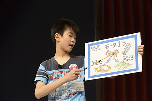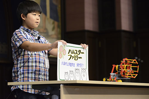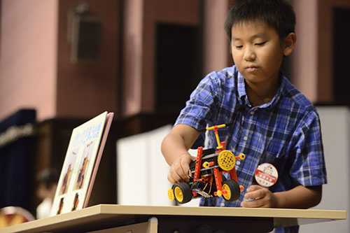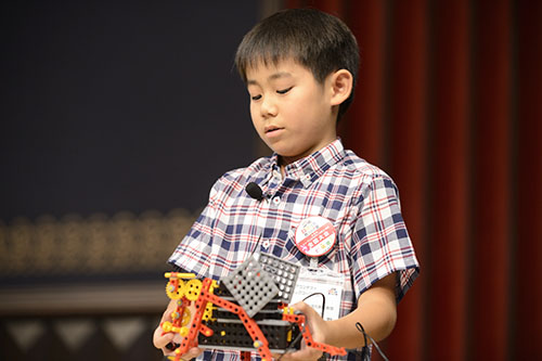 地区予選を勝ち抜いた生徒さんは、ベーシックコースの部9名、ミドルコースの部9名、アドバンスプログラミングコースの部2名。今年は中国の教室からもミドルコースの部に1名出場されました。舞台にあがる生徒さんは、緊張の中で自分で考えて製作したロボットの動きや工夫した点を堂々と発表してくれました。小さなクリエイターたちに、会場からは大きな拍手が送られていました。