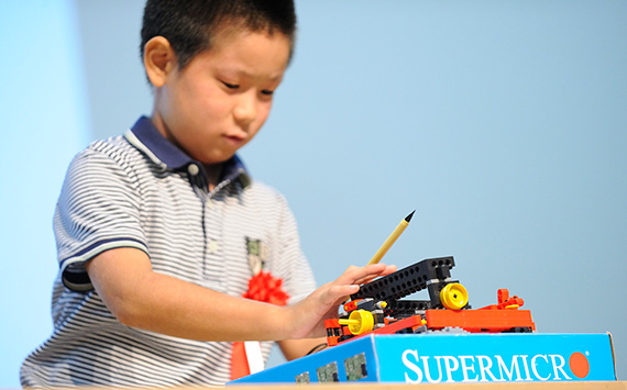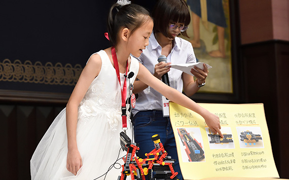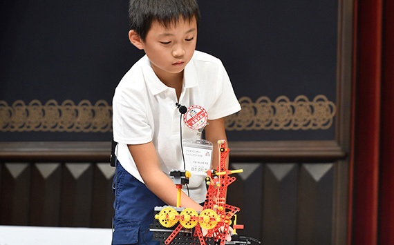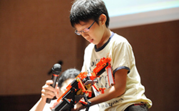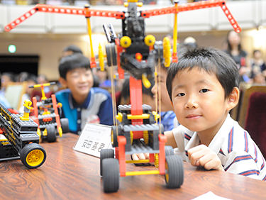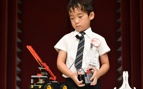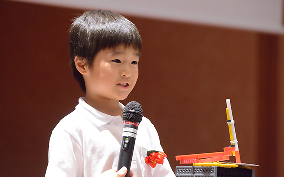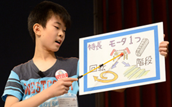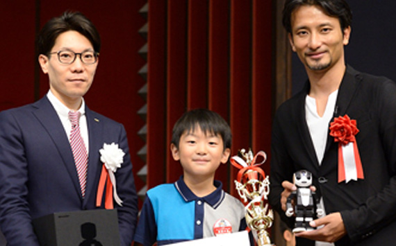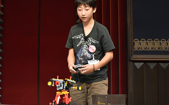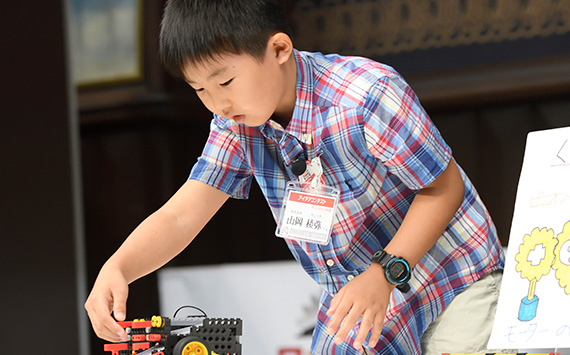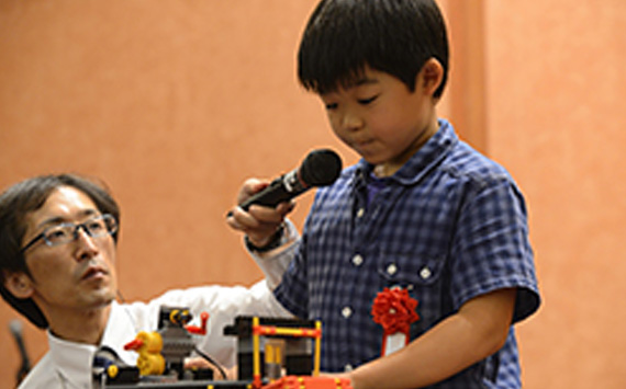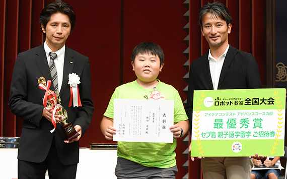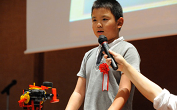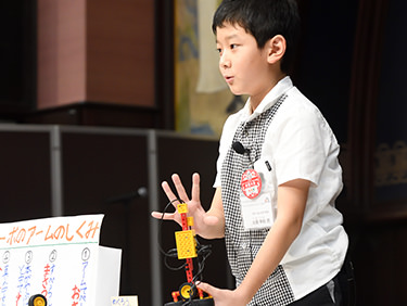 基本のロボット製作キットをベースに、発想とデザインを競う「アイデアコンテスト」では、生徒たちのユニークな発想が連発。ベーシックコースでは、支柱を軸に上下に動くリフトのようなロボットを製作した大澤匠海さんが最優秀賞を受賞。ミドルコースでは、スムーズな足の動きが印象的だったオオカミロボットを製作した、若松拓弥さんが最優秀賞を受賞しました。