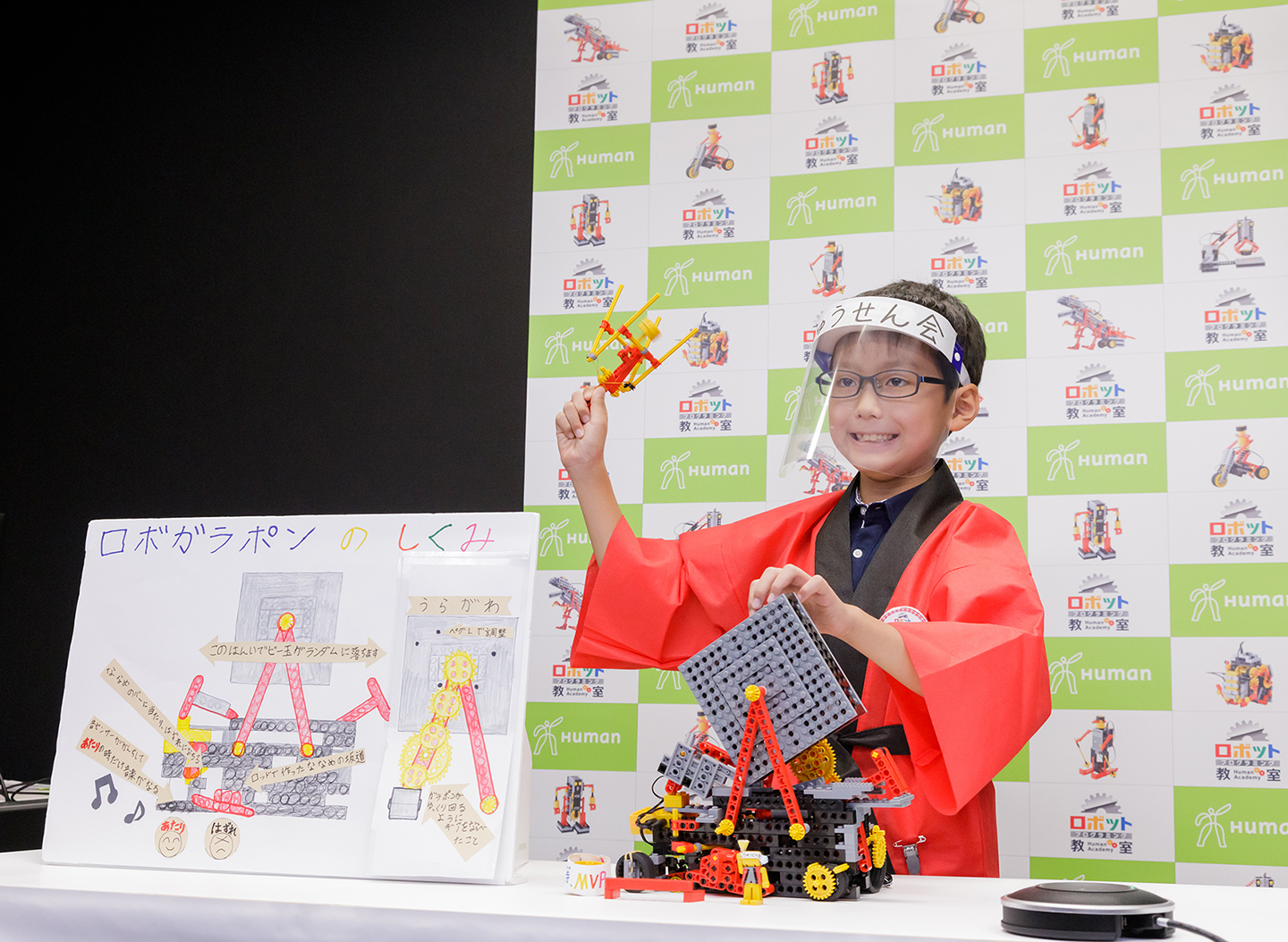 初のオンライン開催となった第10回ヒューマンアカデミーロボット教室全国大会では、国内の各会場をつなぎ、21名の子どもたちの創意工夫が凝らされたアイデアロボットの発表が行われました。