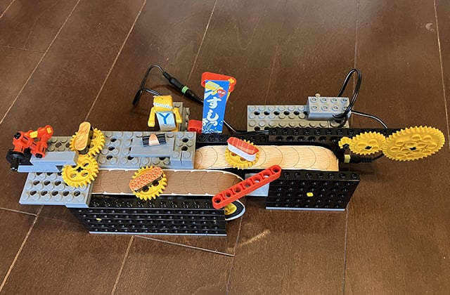 モーターが一個なので、青虫の動力を蝶々の台に接続して蝶々が動くようになっていました。