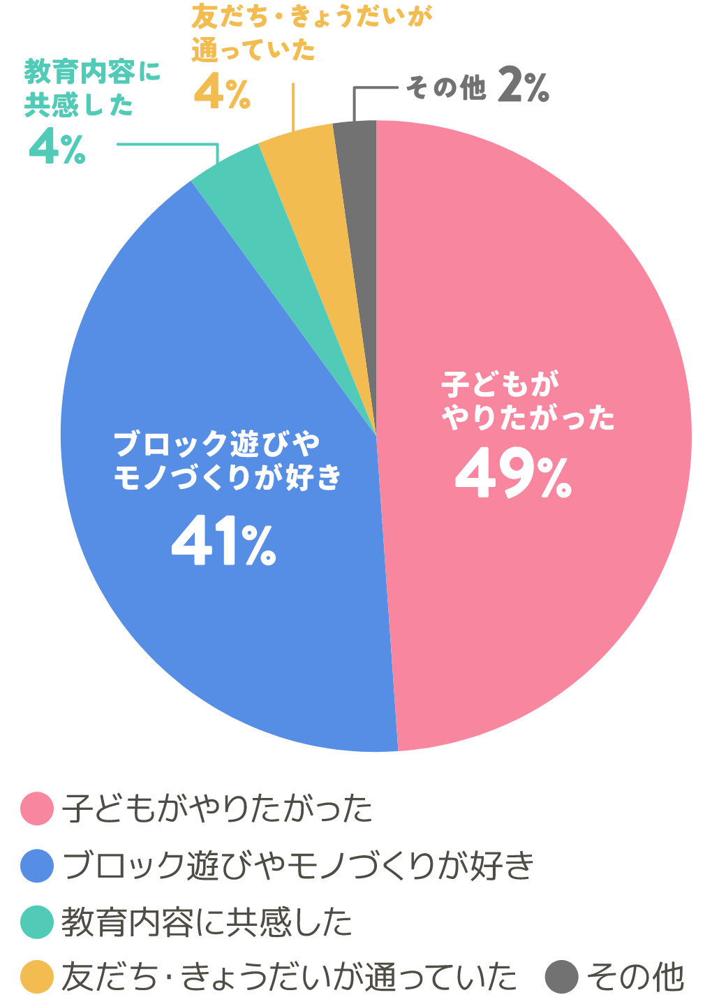 小学校に入ったタイミングまたは小学校低学年から新しい習い事として始める方が多いようです。ただ、小学校低学年で入会した方の24%が「もっと早くから通わせたかった」と回答しており、実際に通い始めてから幼少期からロボット教室の学びを経験させるメリットを感じられているようでした。