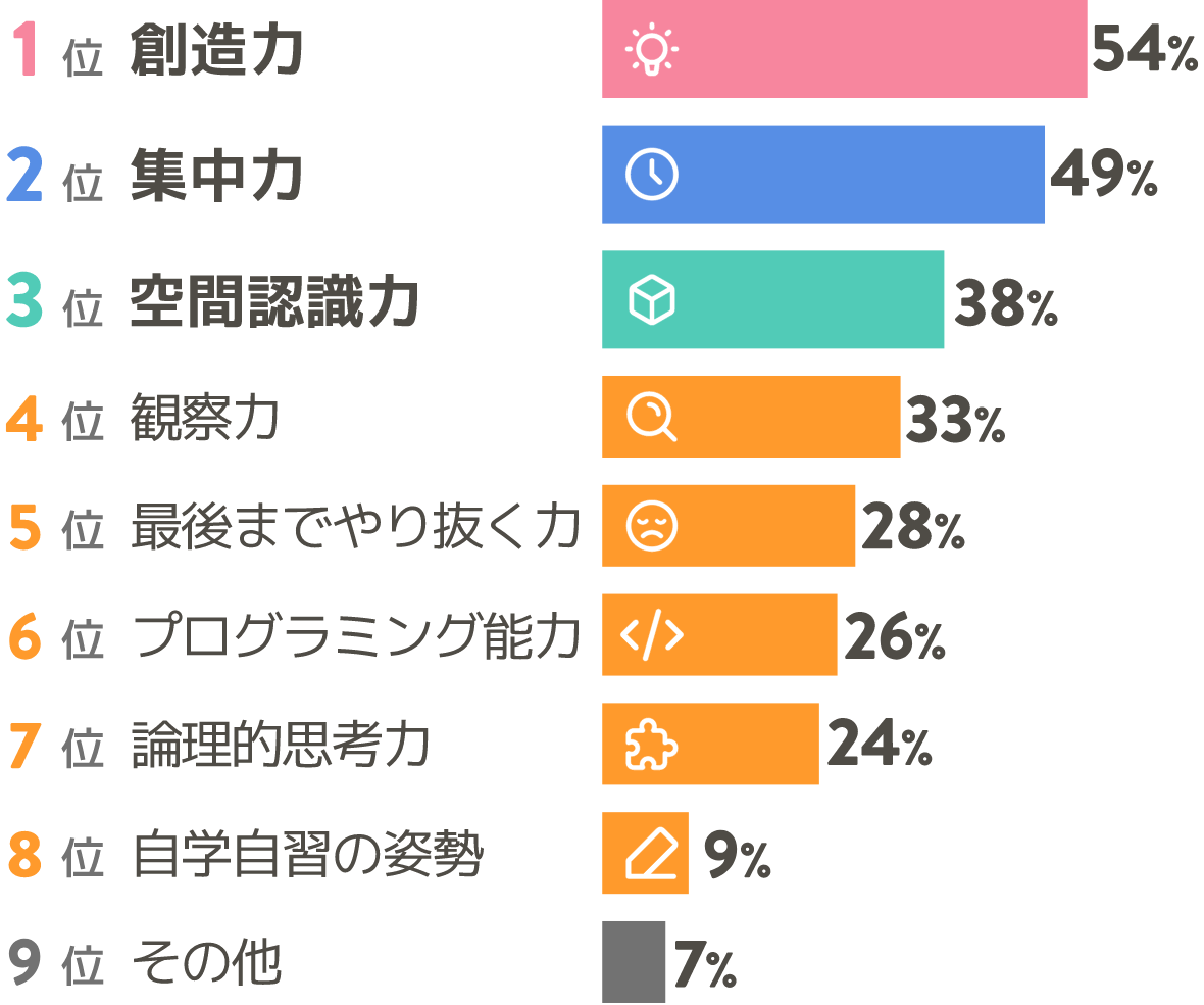 ロボット教室は一から自らの力でロボットを完成させるというものづくりを通した学習コンテンツなので、「ものを生み出す力=創造力」「じっくりと取り組む=集中力」「パーツの組み立て方を考える=空間認識力」などが身につくという回答が多く集まりました!