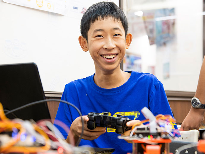 教室では、僕は3年目なので、他の子に教える側に回ることもあります。先生は、分からないことがあるとヒントを優しく説明してくれます。けど、ぜんぶ教えないで、自分で考えるように導いてくれる感じが良いです。普段の生活の中で、こんなロボットがあったらいいのに、とアイデアも浮かぶようになりました。