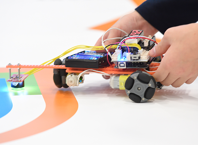 今回、緑色を読み取りクランクを抜けられるかどうかが勝負の分かれ目になったと思いますが、決勝戦の両者ともセンサーの配置が良かったと思います。1mm、0.5mmでかなり差が生じてしまうので、ネジで微調整できるように組み立て、コースの凹凸もうまく乗り越えて色を読み取れるように「セッティングをした」のがうまくいった要因だと思います。
